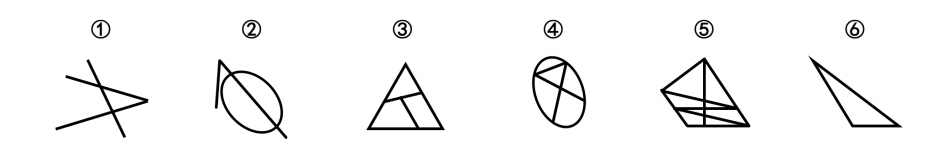 观察题干图形,组成元素不同,优先考虑数量类或属性类。整体第六个图形比较简单,一个封闭空间且属于一笔画图形,顺其思路考虑。发现图①③⑤的奇点数为4,笔画数为2,图②④的奇点数为2、⑥的奇点数为0,笔画数均为1,分为两组。