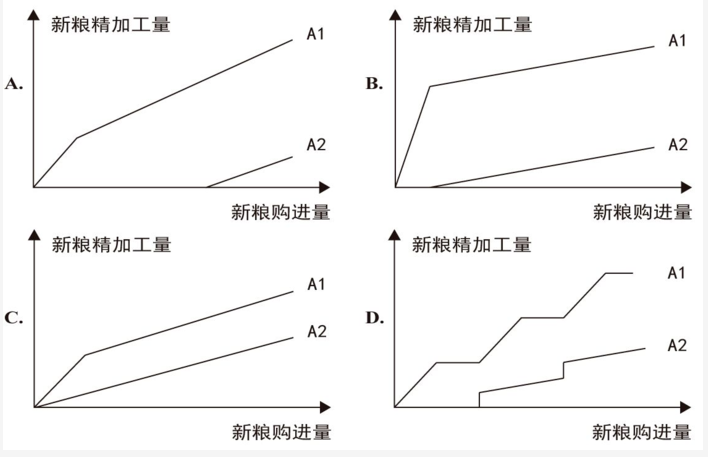 某饲料厂原有旧粮库存Y袋,现购进X袋新粮后,将粮食总库存的1/3精加工为饲料。被精加工为饲料的新粮最多为A1袋,最少为A2袋。若所有旧粮、新粮每袋重量相同,则以下哪个坐标图最能准确描述A1、A2分别与X的关系( )