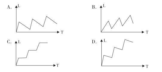 甲和乙两条自动化生产线同时生产相同的产品,甲生产线单位时间的产量是乙生产线的5倍,甲生产线每工作1小时就需要花3小时时间停机冷却而乙生产线可以不间断生产。问以下哪个坐标图能准确表示甲、乙生产线产量之差(纵轴L)与总生产时间(横轴T)之间的关系?