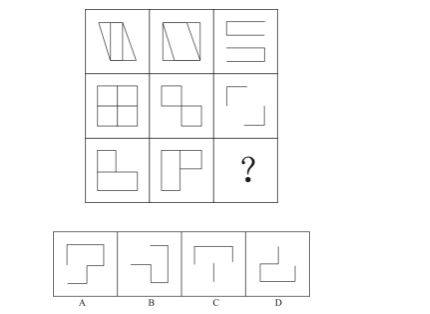 观察题干图形,发现元素组成相似,且出现相同线条,优先考虑图形相似中的叠加规律。九宫格优先看横行,第一行中,图1和图2去同存异之后再顺时针或者逆时针旋转90度,得到图3;经验证,第二行也满足此规律;第三行应用此规律,故问号处应选择一个图1和图2先去同存异再顺时针或者逆时针旋转90度得到的图形。观察选项发现,逆时针旋转无答案,只有顺时针旋转90度得到D选项。