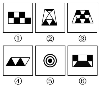 观察图形发现,图形相似度较低且组成形状不同,图形①中黑色图形只有正方形一种,②中黑色图形有梯形和三角形两种,③中黑色图形只有梯形一种,④中黑色图形只有三角形一种,⑤中黑色图形有圆和圆环两种,⑥中黑色图形有长方形和梯形两种,所以,可以根据黑色图形的种类数分组,①③④为一组,②⑤⑥为一组。