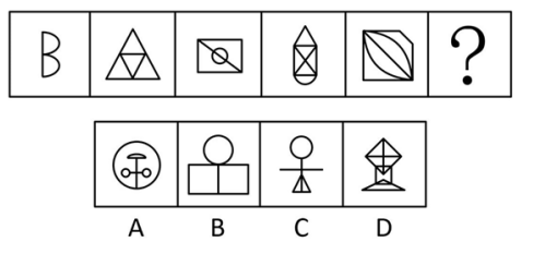 观察图形变化,图形相似度不高,组成不同,优先考虑数量关系,观察图形可知,图形整体组成形状较为规整,对称性明显,但四个选项均符合此特点,不可排除;继续观察发现,图形均为一个整体,故可考虑笔画数,题干均为一笔画图形,A、C、D均为两笔画,只有B项满足一笔画。