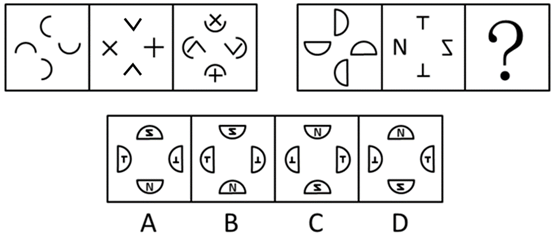 元素组成相似,观察发现第三个图形中的组成元素包括前两个图形中的所有组成元素,考虑组合叠加。第一组图形的规律为:第一个图形整体逆时针移动一步+第二个图形整体顺时针移动一步=第三个图形。第二组图形遵循同样的规律,平移叠加后得到的图形为D选项。