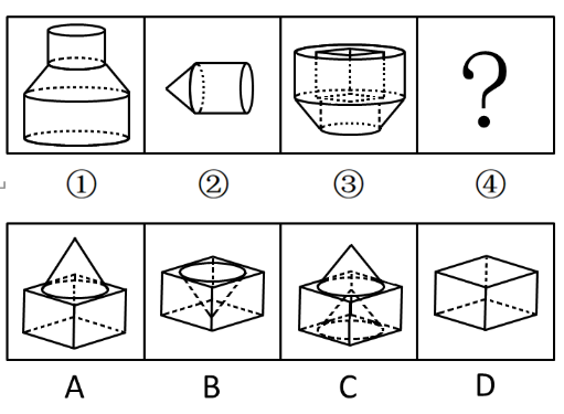下图中的立体图形①是由立体图形②、③和④组合而成,下列哪一项能够填入问号处:
