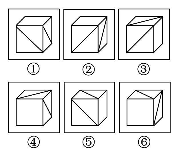 观察整组图形,每个六面体都有两个含有对角线的面和一个空白面,考虑六面体和六面体之间的规律。图①向上翻转90可得图,图顺时针旋转90可得图;图向上翻转90可得图4顺时针旋转90可得图五,即①③⑥图形一致,②④⑤图形一致。