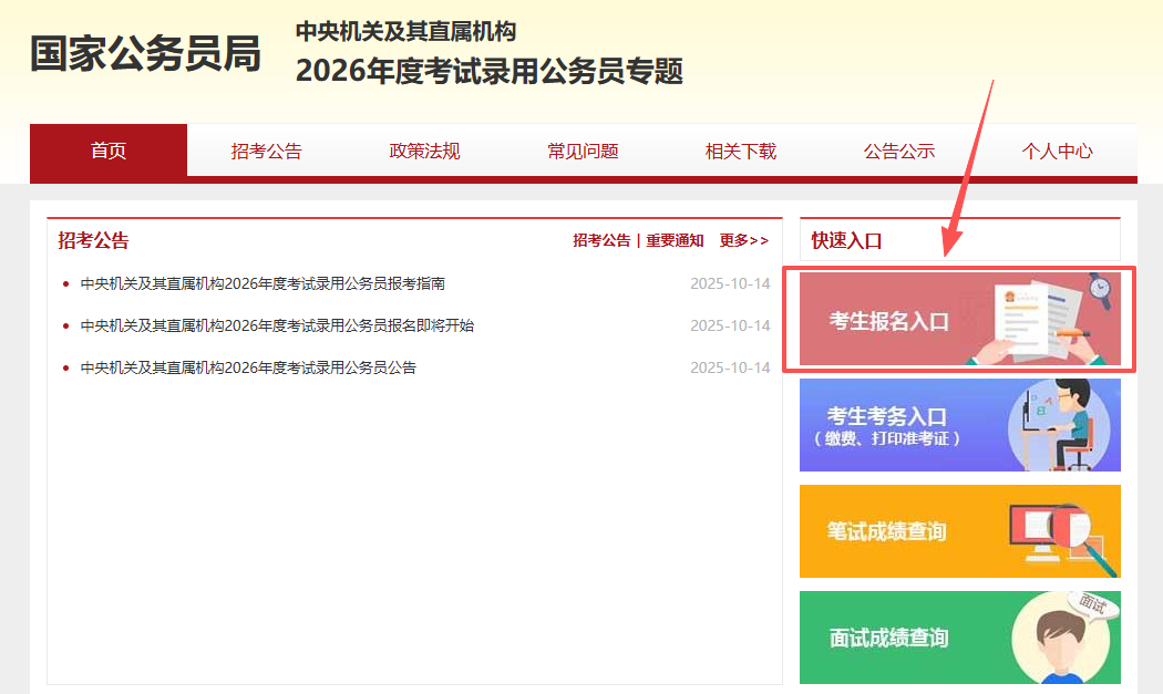 考生需登录国家公务员局官网“中央机关及其直属机构2026年度考试录用公务员专题网站”(网址:http://bm.scs.gov.cn/kl2026),完成注册并填写报名信息。