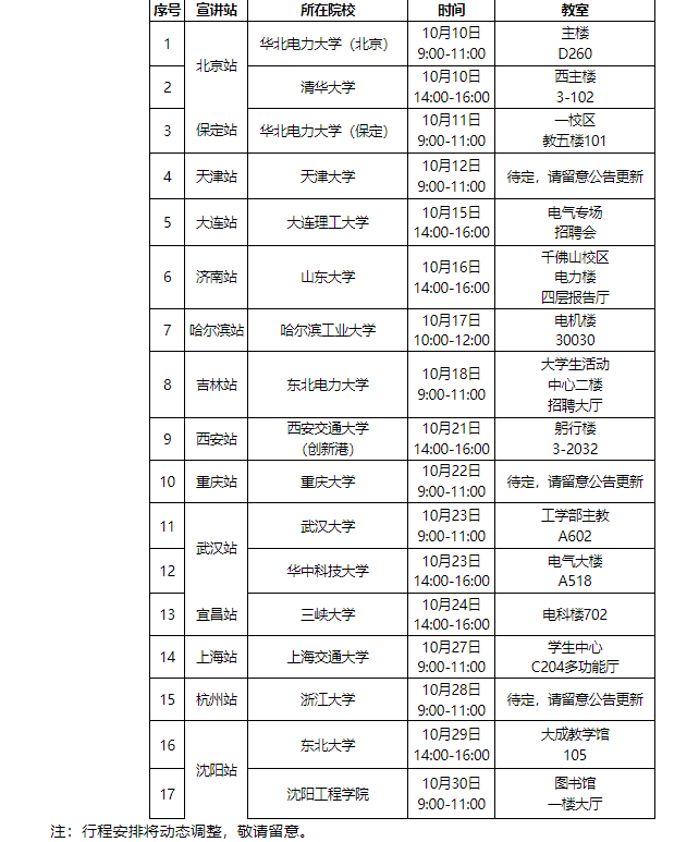 公司预计将在下列地区设置宣讲站。详细行程安排请留意本公告动态。