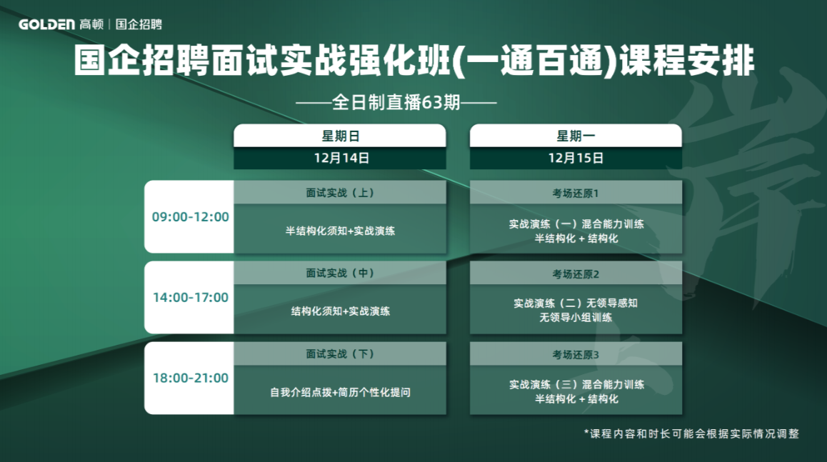高顿的国企面试课程覆盖“基础夯实-专项突破-实战模拟-考前冲刺”全阶段。基础阶段梳理国企面试高频题型,结合国企价值观提炼答题框架;专项阶段针对无领导小组讨论、结构化面试设计专项训练,通过“答题-点评-优化”循环提升逻辑性与表达流畅度;实战阶段采用“模拟国企考官组+真实评分表”的形式,还原评分维度,并针对薄弱环节定向强化。