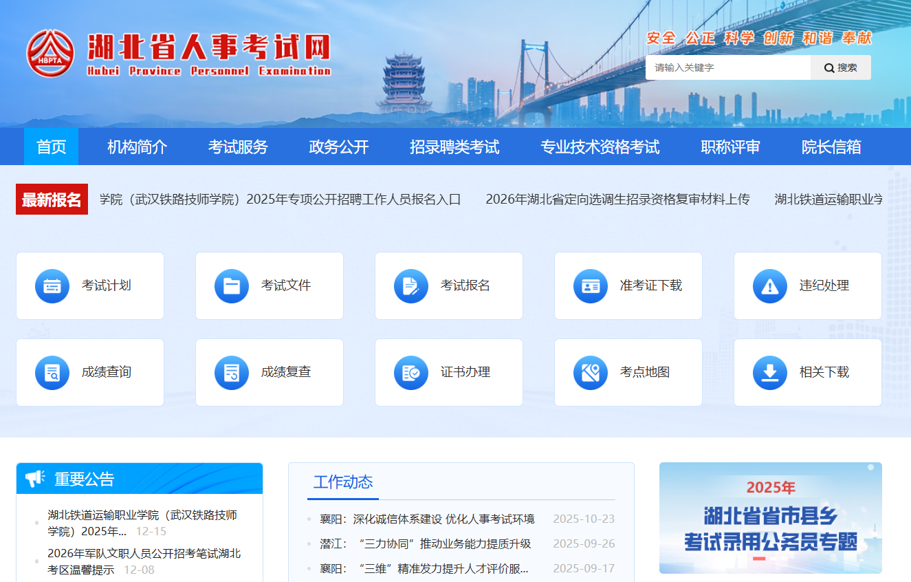 湖北省公务员考试的官方网站是湖北省人事考试网(https://rst.hubei.gov.cn/hbrsksw/),报名入口就在这个网站上,考生需在此完成网上注册、信息填写、职位选择、缴费等操作。2026年湖北省公务员考试预计2026年1月上旬发布公告,报名时间持续6天左右。考生需密切关注湖北省人事考试网获取最新信息。