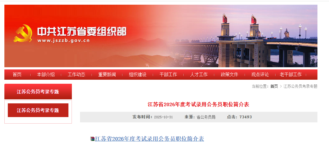 江苏省考正式启动啦!考试公告和职位表都已经发布,大家可以在中共江苏省委组织部网站(www.jszzb.gov.cn)、江苏省人力资源和社会保障厅网站(jshrss.jiangsu.gov.cn)及各设区市相关网站下载职位表,此次一共招录