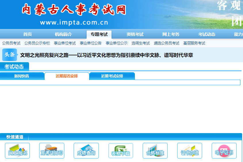2026年内蒙古省考的报名入口为内蒙古人事考试网(网址:http://www.impta.com.cn)。考生需在该网站的“公务员招考/专题”栏目中查看公告、职位表以及进入报名系统。
