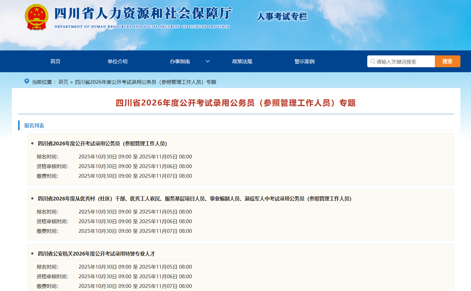 四川省2026年公务员考试的报名工作即将启动,有的小伙伴还不知道2026四川省考报名入口是什么?报名入口为四川省2026年度公开考试录用公务员(参照管理工作人员)专题网站,报名时间是10月30日-11月5日。下面上岸鸭公考小编就给大家详细介绍一下相关内容!