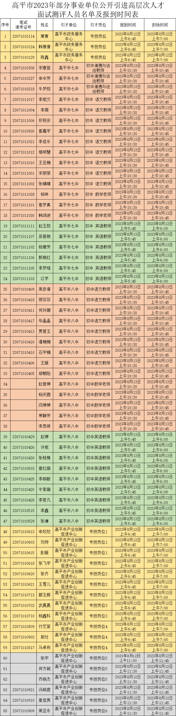根据《山西省高平市2023年部分事业单位公开引进高层次人才公告》相关要求:“如果报名人数不超过岗位名额,采取考察的方式直接进行考核;如果报名人数超出岗位名额且不超岗位名额5倍,采取面试测评与考察的方式进行考核;如果报名人数超出岗位名额5倍,采取笔试测评、面试测评与考察的方式进行考核”,此次通过笔试测评入围面试测评57人,直接进入面试测评8人。具体名单见附件1。