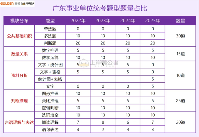 从历年考情来看,广东事业单位统考具有"三统一"特点:统一考纲、统一时间、统一试卷。全省综合岗、教师岗、医疗岗所有岗位使用同一份试卷,不分ABCDE类别,也不参与全国事业单位联考。考试时长通常为90分钟,总题量100道题,满分100分。