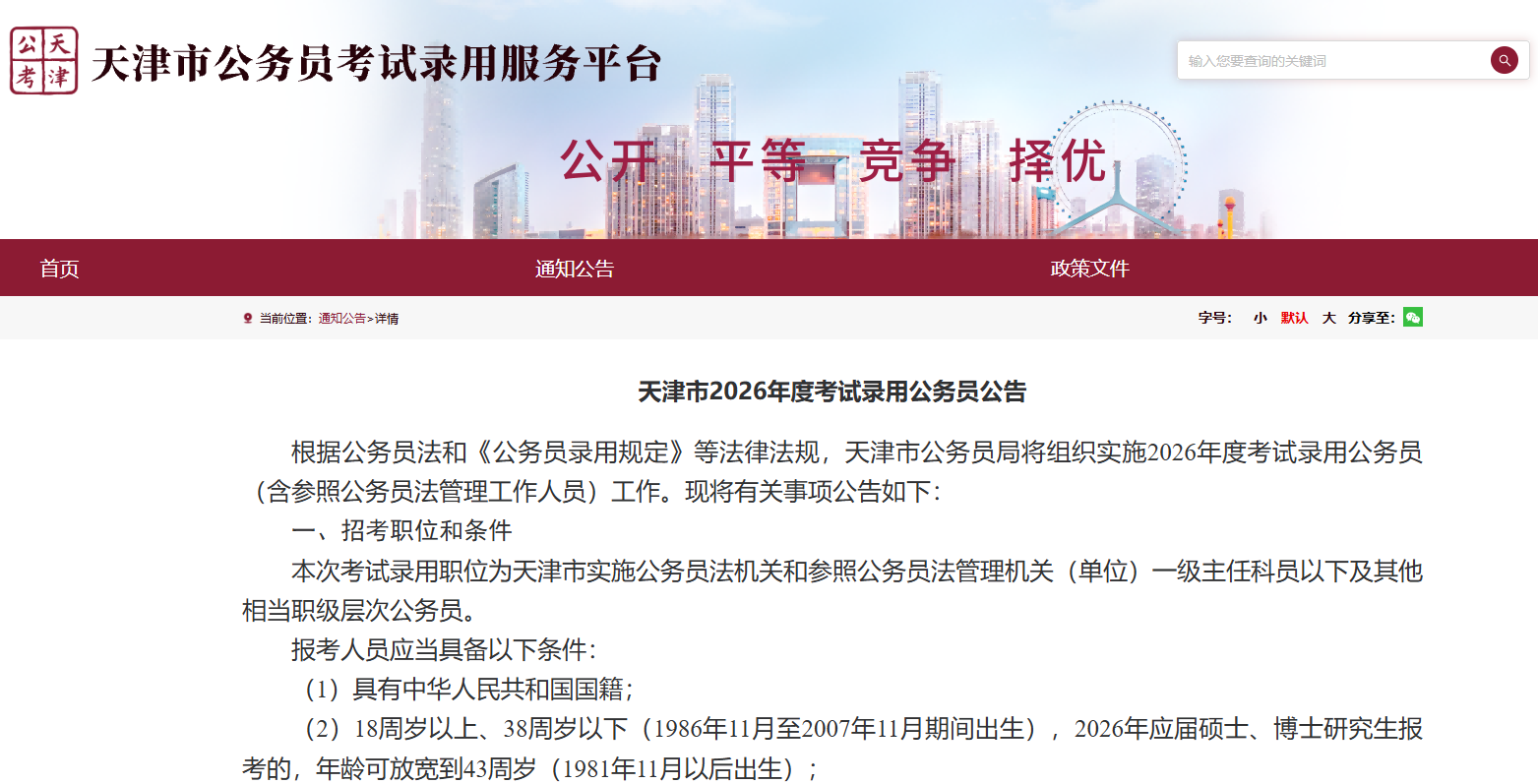 2026天津公务员考试公告和职位表都已发布,2026天津市考正式启动!此次一共招考1796人,年龄放宽至38周岁以下!报名时间是11月5日-11月11日,笔试时间是12月6日、7日。下面上岸鸭公考小编就带大家详细了解一下相关内容!