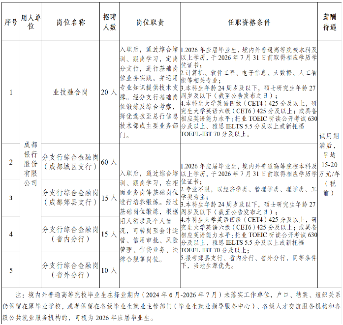“成都银行2026年秋招(第二批次)公告发布!招120人”