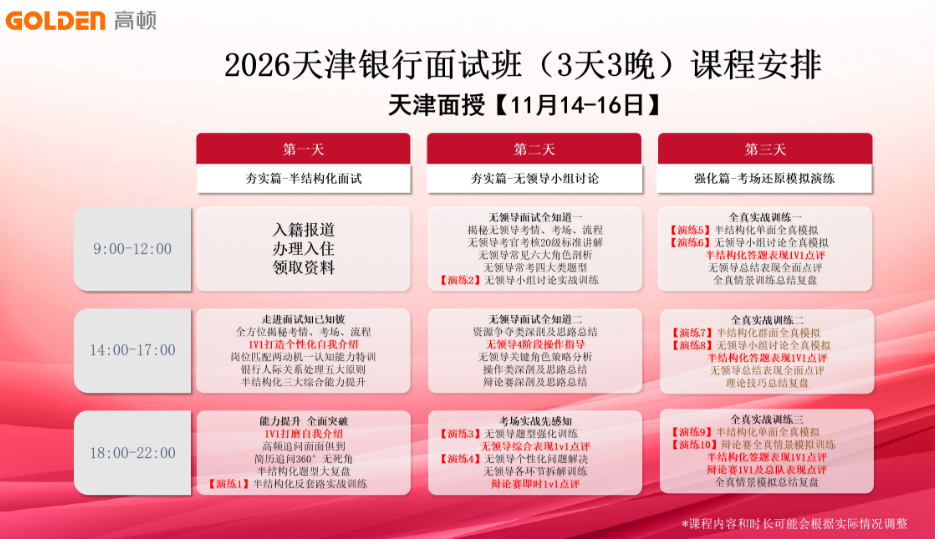 天津线下3天3晚包住宿,6-12人模拟对练,资深老师授课,怎么面怎么学,面试课程安排参考如下:
